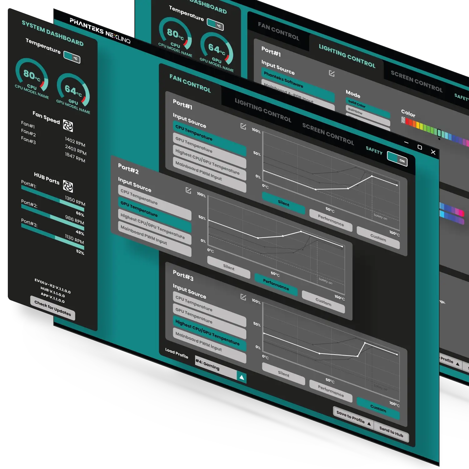 The Phanteks Nexlinq Windows App is a very lightweight application taking very little resources yet presents a comprehensive overview of core system stats and powerful fan control settings. Users can automate fan RPMs through either automatic or manual PWM curves, based on CPU or GPU temperatures or whichever is higher. The lighting effects have been carefully curated to offer a wide range of tastefully executed options to personalize your build.
