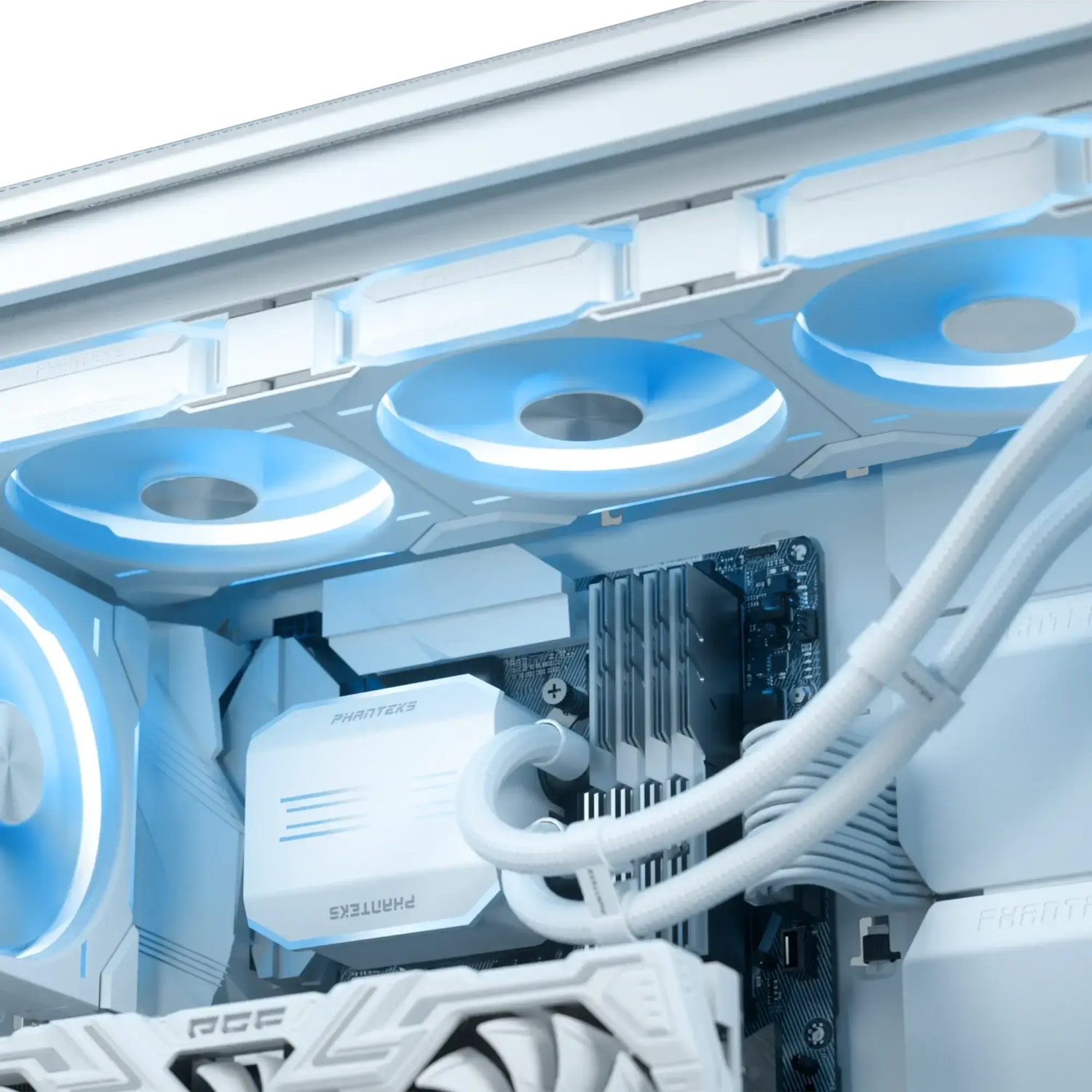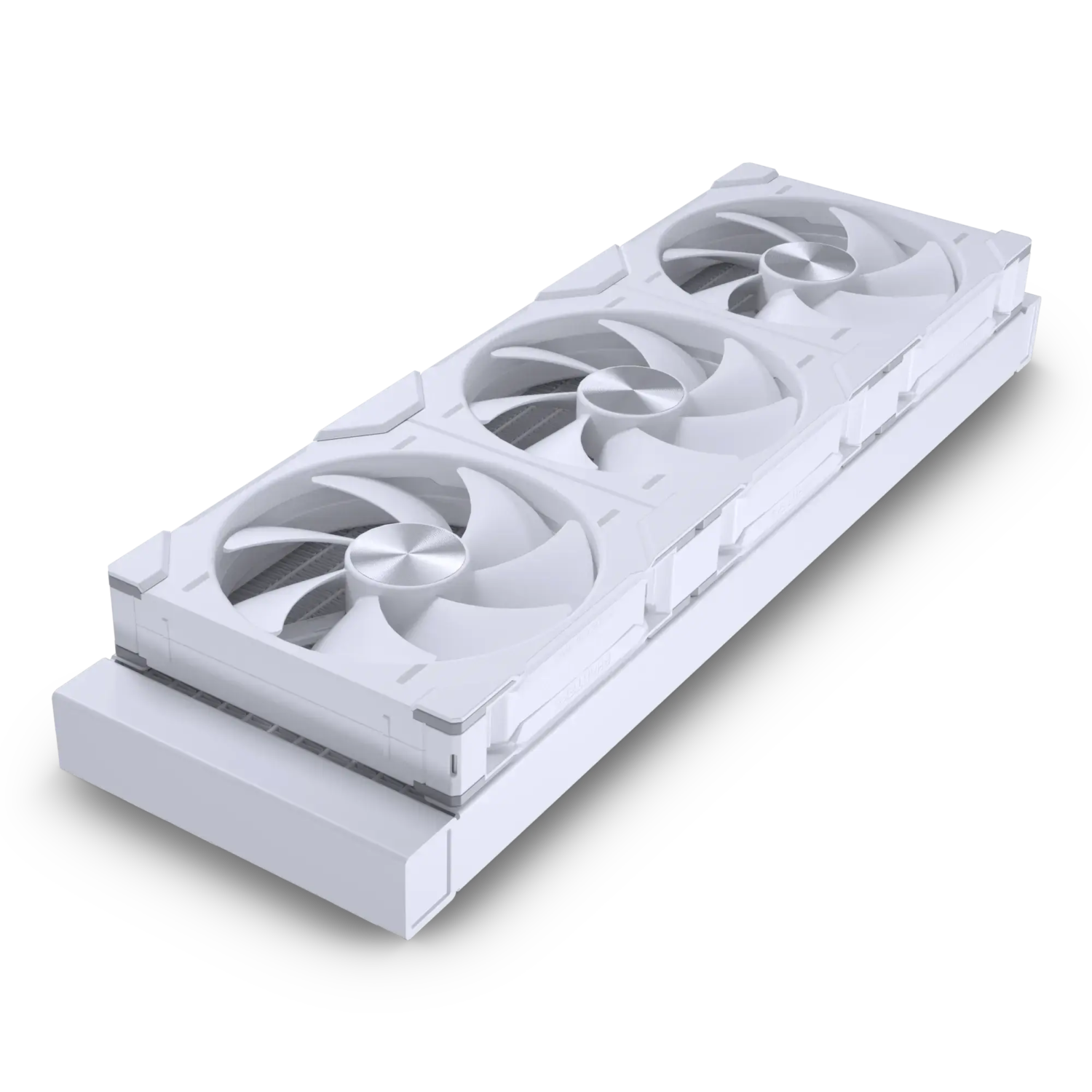 The Glacier One D30 AIO cooler is a high-performance cooling solution that offers a smooth D-RGB lighting solution thanks to the D30 fans. The Glacier One D30 AIO cooler equipped with D30 fans, can be daisy-chained and controlled through a single cable. Its large copper base and fin array make it suitable for use with high-end CPUs, while its design allows for maximum clearance with motherboard and RAM components.